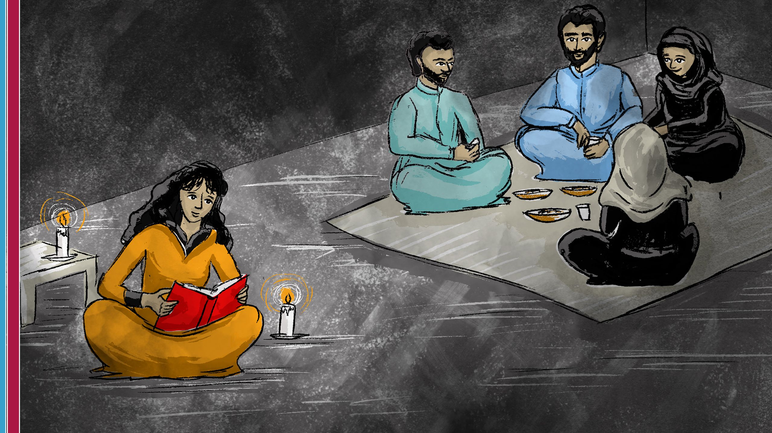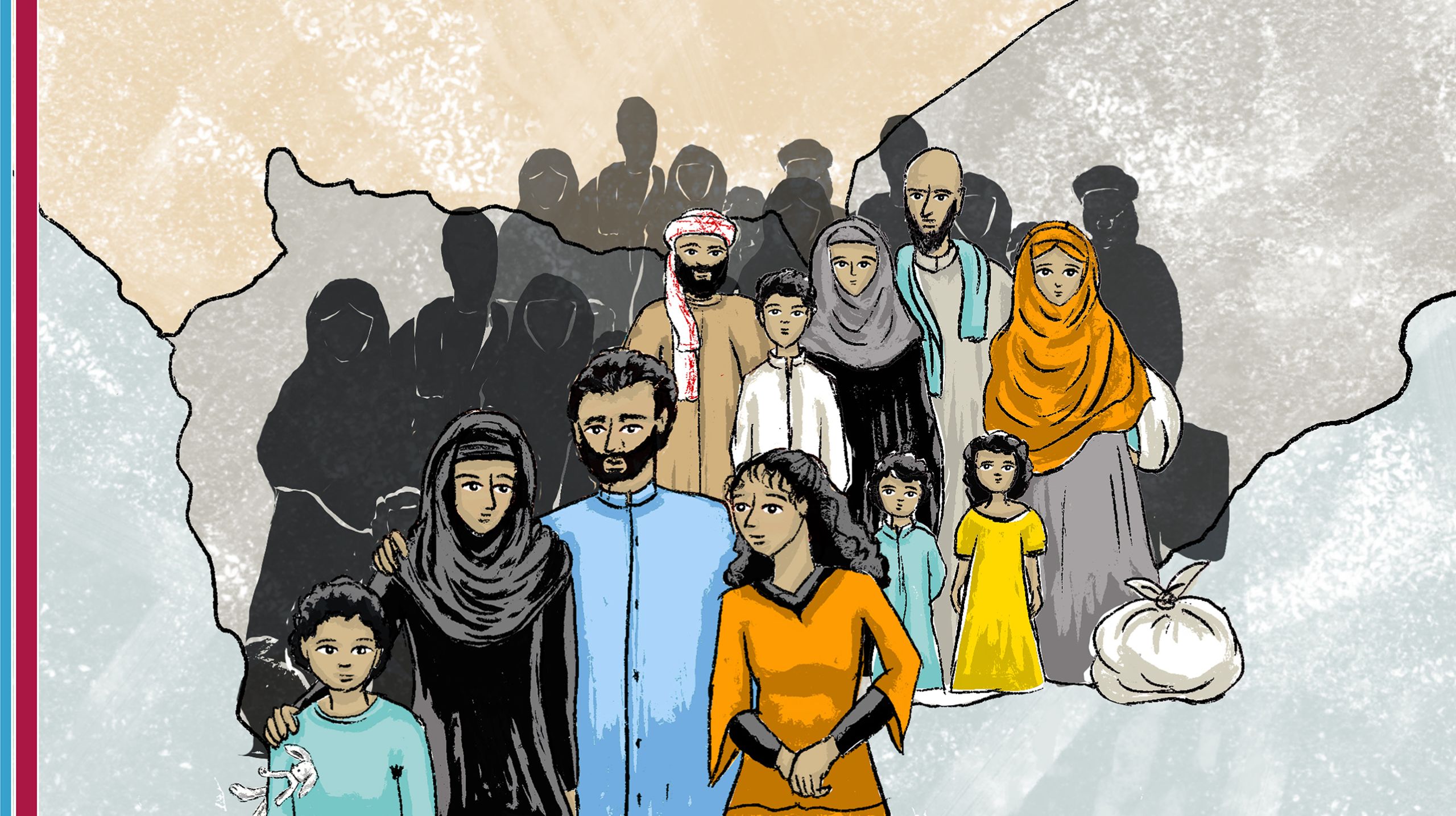 وبعد رحلة شاقة، تصل عائلة حسن إلى مخيم للنازحين والمشردين داخليا. إنهم جائعون ومتعبون. وفي الرحلة فقدوا كل متعتهم وممتلكاتهم. وهم يفقدون السكن والوطن.